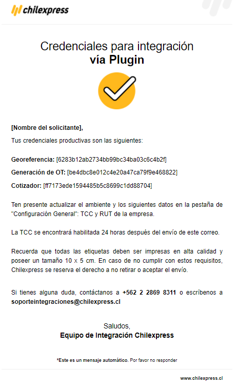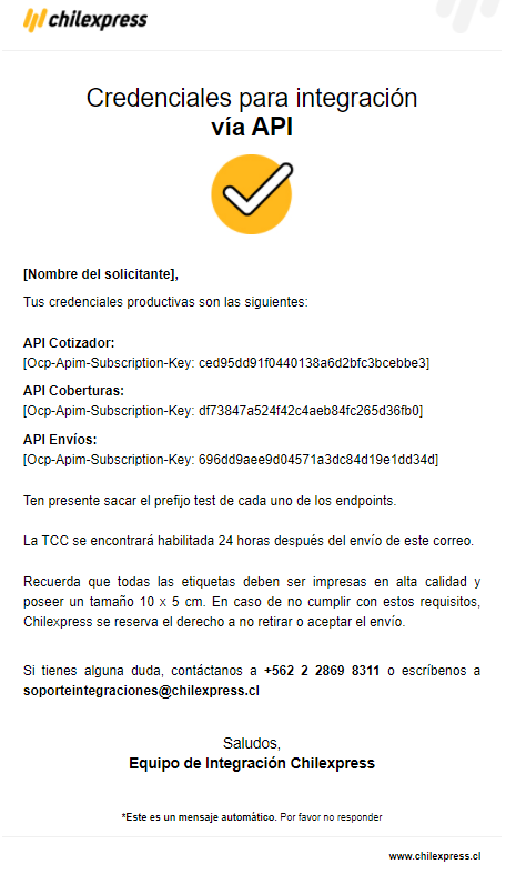 Antes de 24 hrs te haremos llegar un mail con tus credenciales productivas para los servicios de integración, y tu TCC (Tarjeta de Cliente Chilexpress) en caso de haberla solicitado.